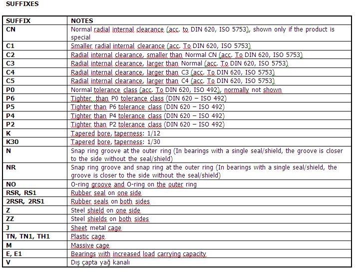Wenn ein Kugellager beispielsweise Dichtungen oder grössere Lagerluft als normale Lagerluft hat, ist dieser Zustand mit Vor- und Endkurzzeichen kodiert, bestehend aus den Zahlen und Ziffern.